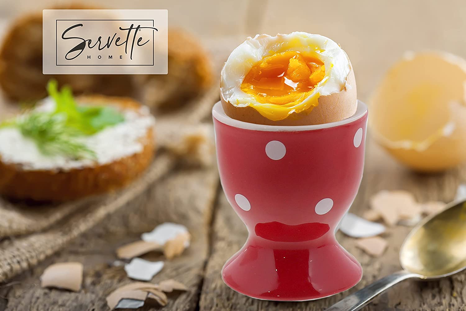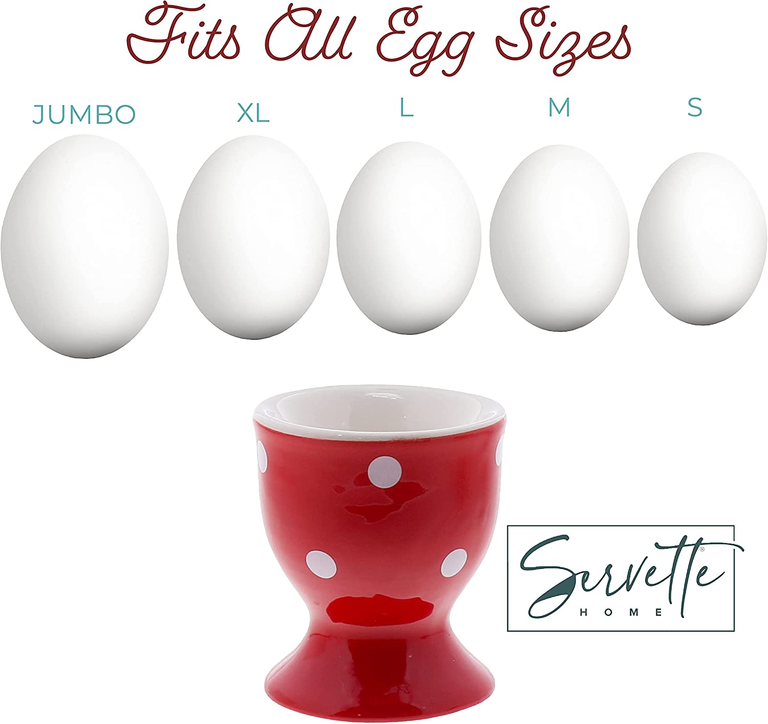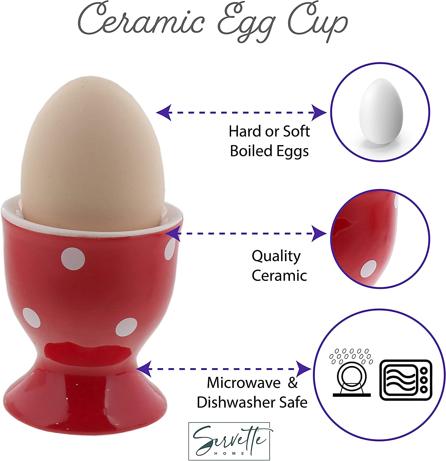 Regular price $12.99These delightful red egg cups will bring a touch of sunshine to the breakfast table and are perfect for everyday use. Designed of quality ceramic with a painted polka dots design which adds a touch of humor and bright farmhouse style while eating your soft-boiled egg. Comes with 2 red egg cups. Makes a great gift!