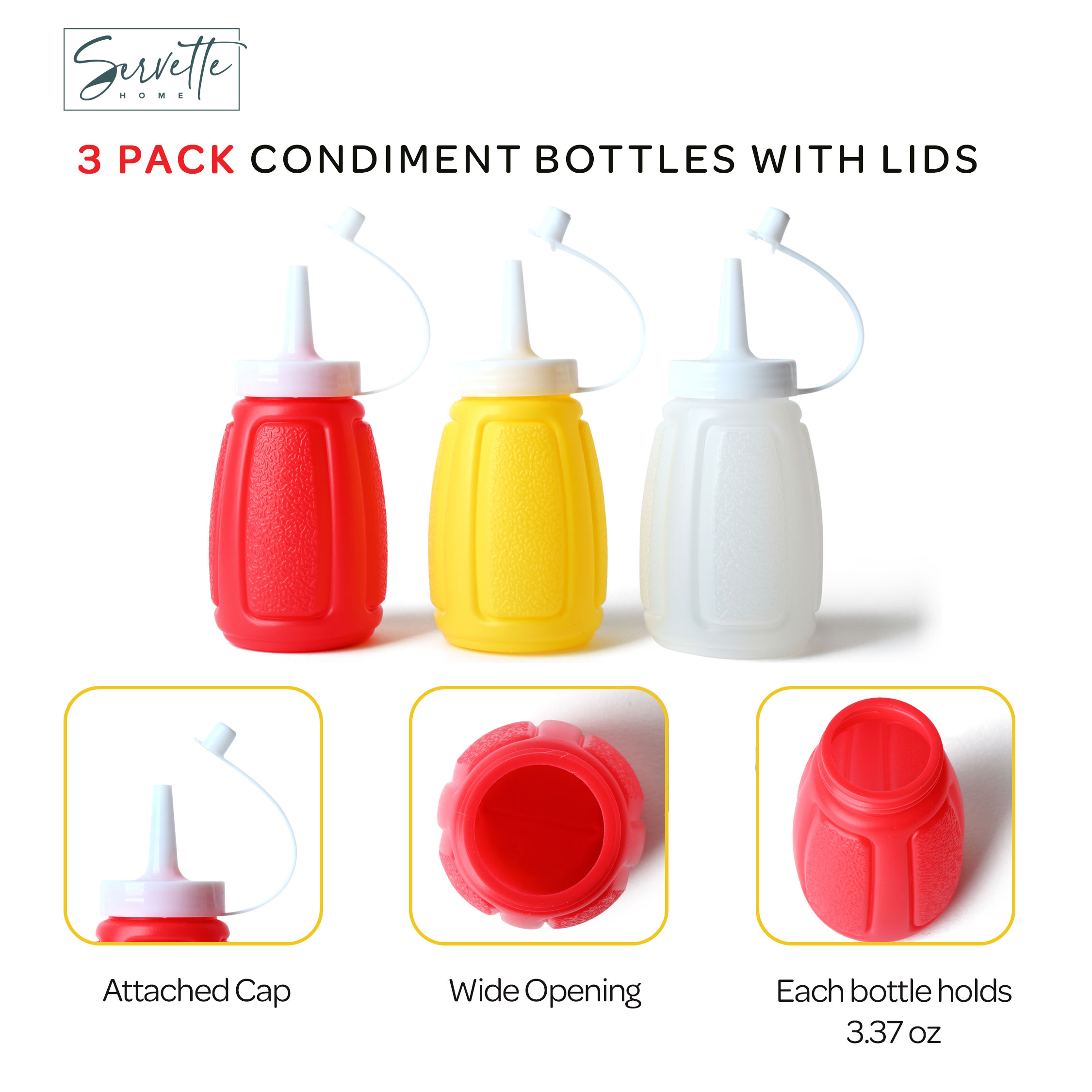 Servette Home Condiment Squeeze Bottles with Attached Caps, Yellow Red Clear, 3.37oz Capacity, 3 Pack