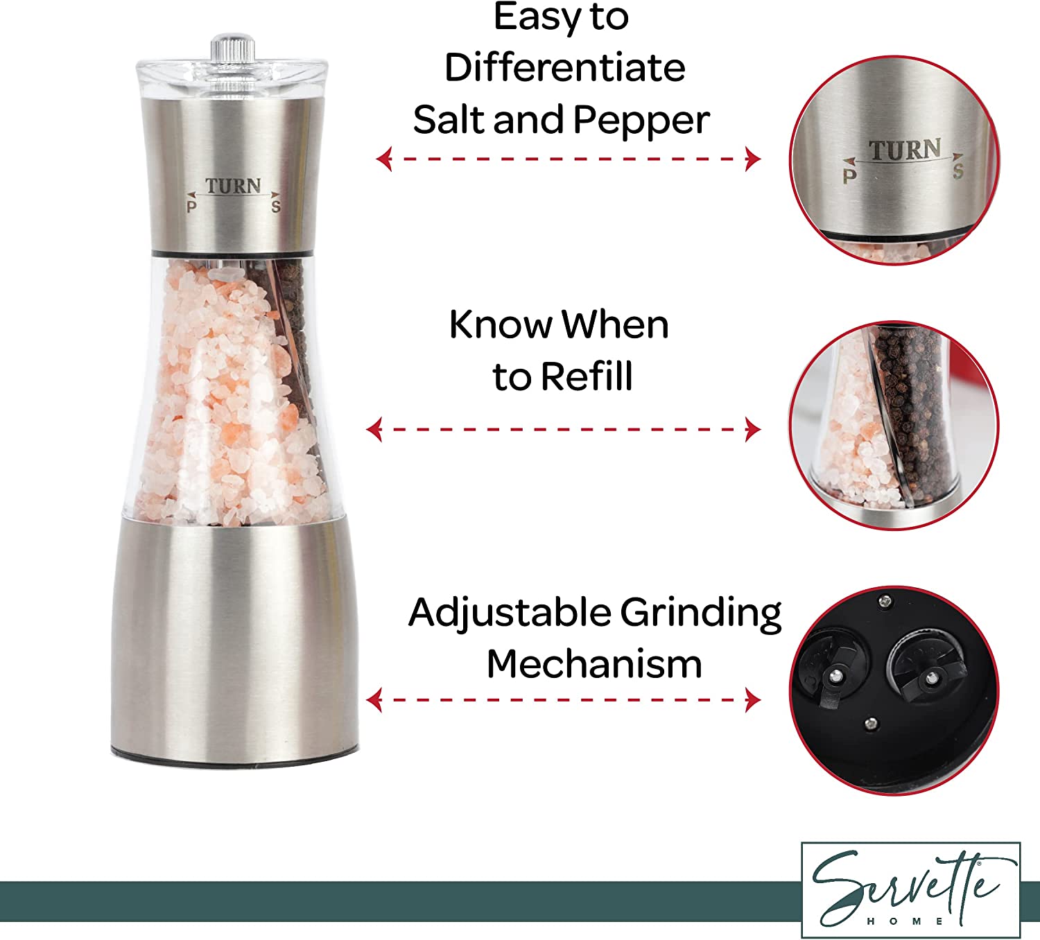 - ADJUSTABLE GRINDER - Easily adjust the grind size of your salt or pepper with our adjustable grinder. Simply twist the knob to select your desired grind size.
