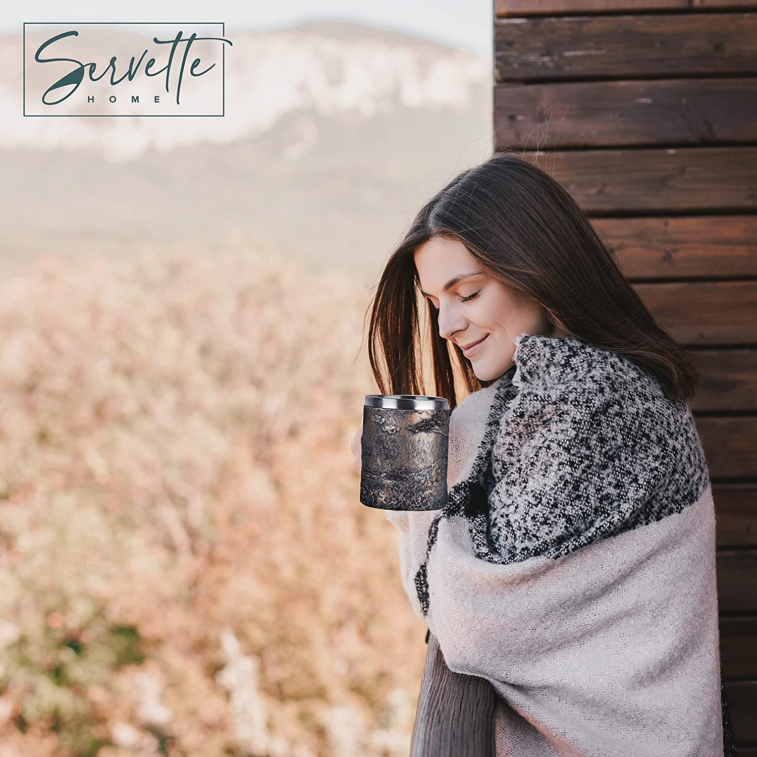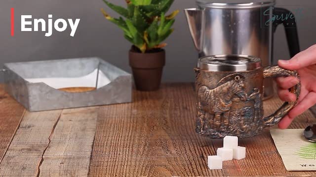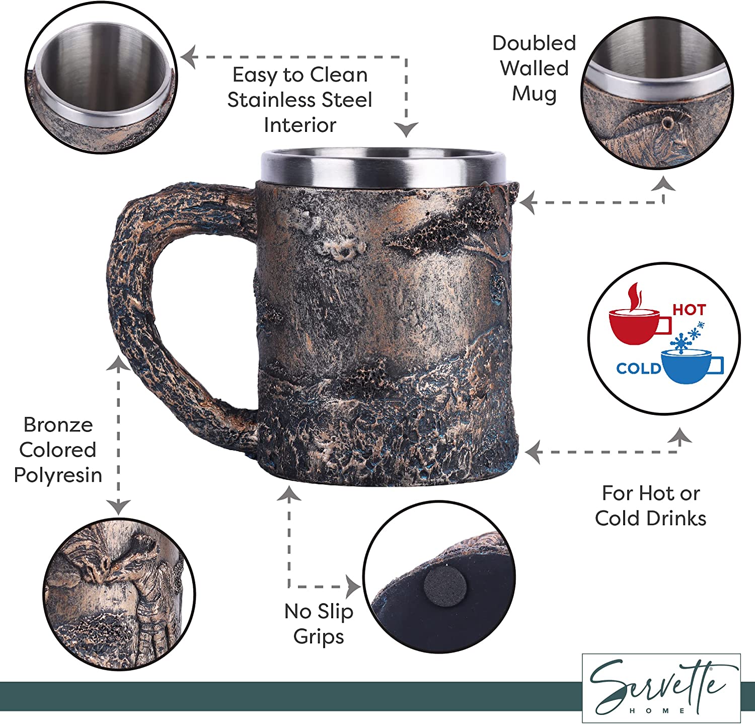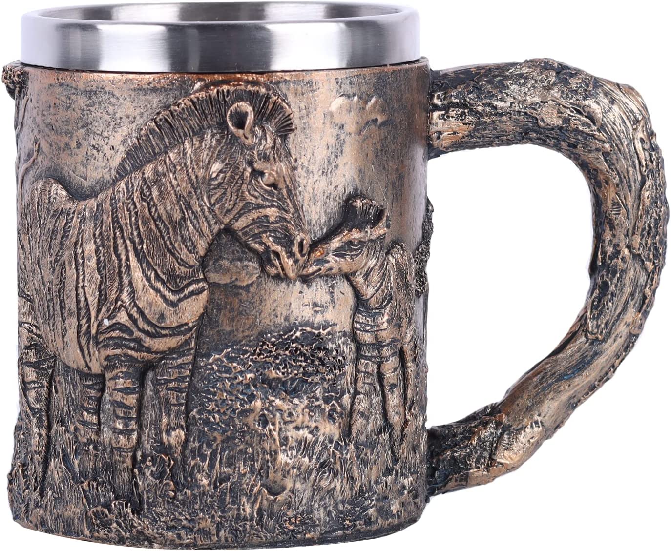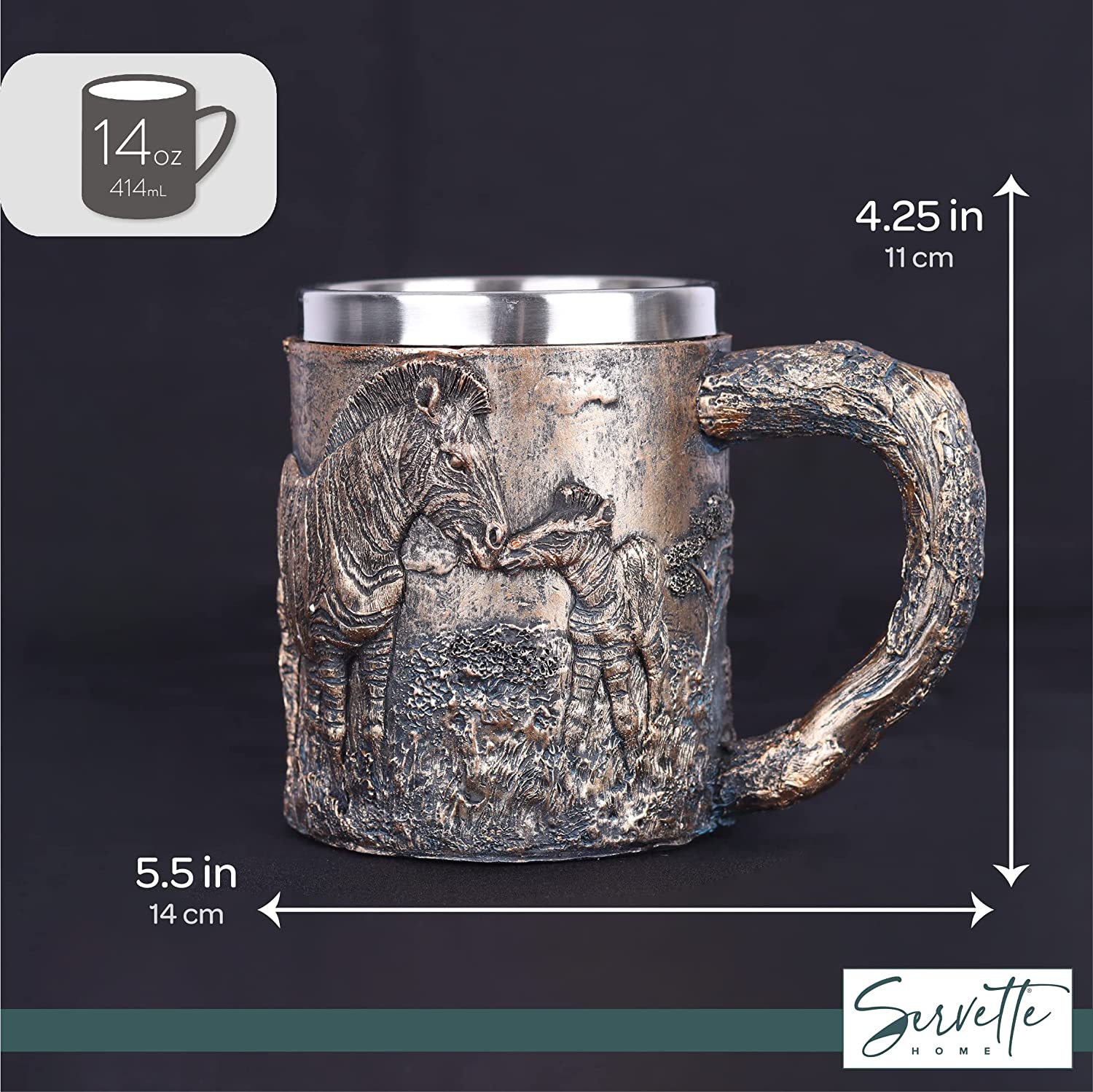 Regular price $16.99This wildlife zebra themed mug is perfect for those safari lovers out there. You can use this mug for your hot or cold beverages, made with a stainless steel interior. Quality poly resin painted in a beautiful bronze will make a statement wherever you go! Take it outdoors, indoors or keep it for you rustic décor. Gift it to your friends, family, or fellow safari traveler. This mug is made of stainless steel and bronze poly resin on the outside. Featuring a beautiful scene of mother and child zebras. Grips on the bottom of this mug will keep it from tipping over. Large handle makes it easy to hold. Keep your beverages hot or cold with stainless steel interior.