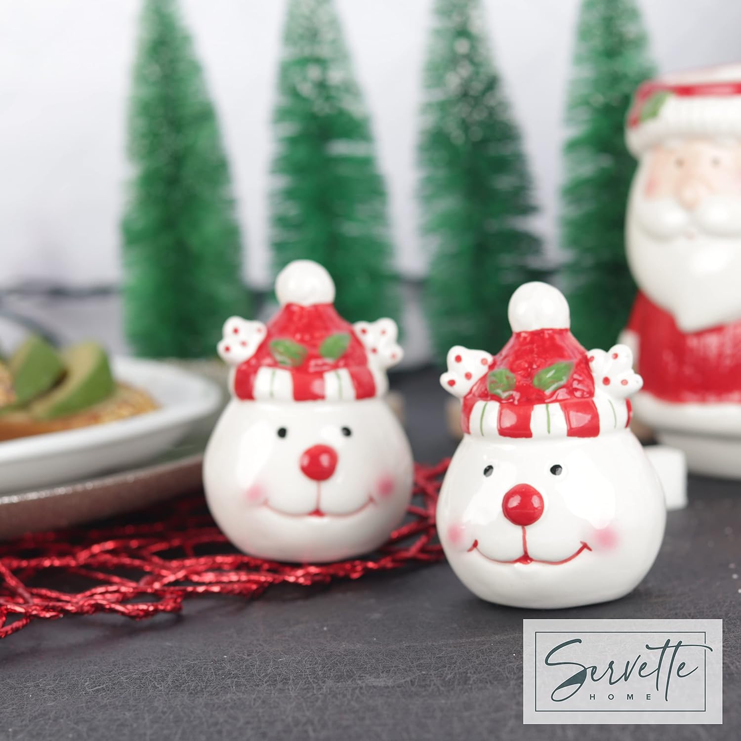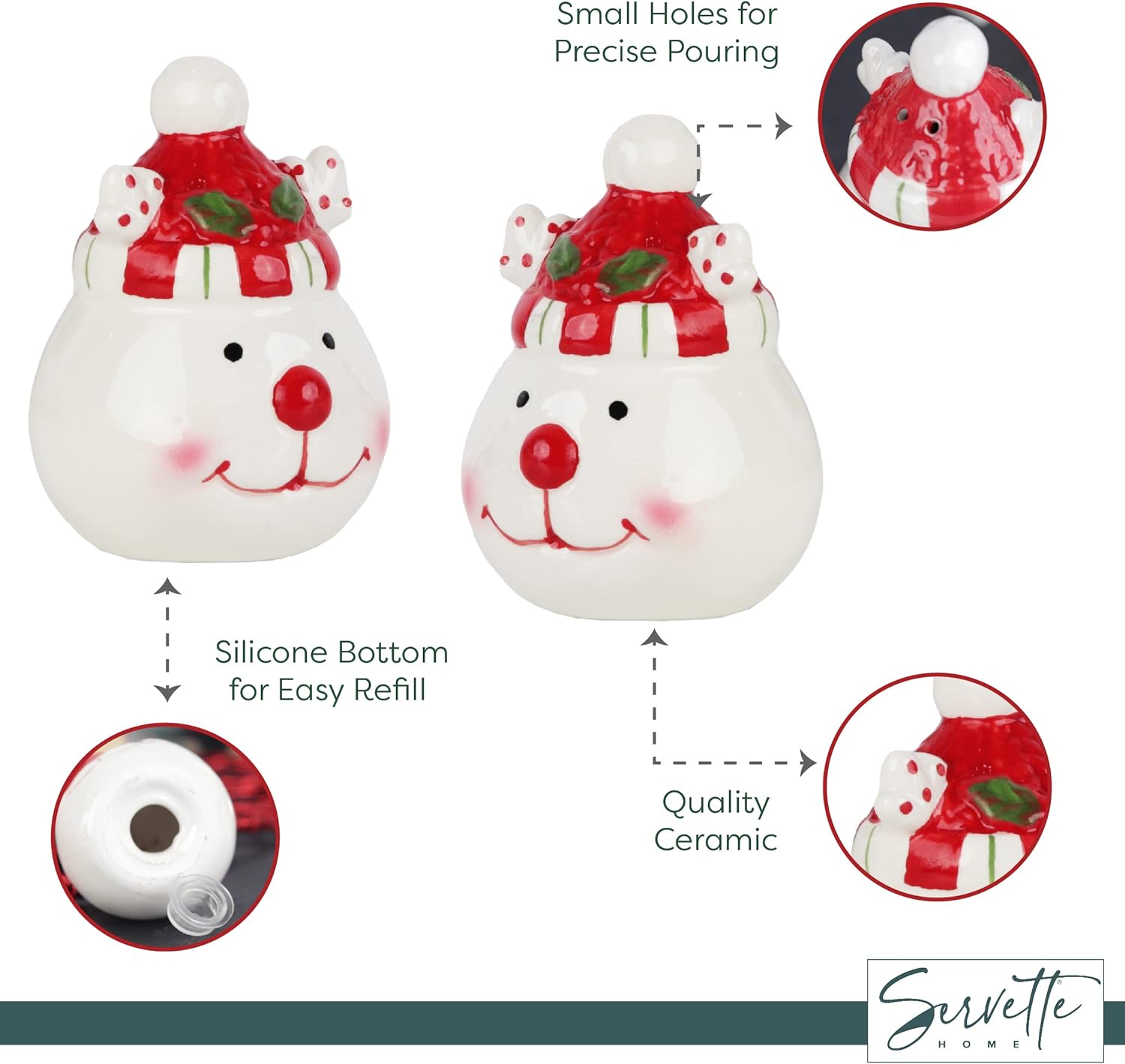 Fun Ceramic Christmas Holiday Novelty Kitchen Salt and Pepper Shakers for the home chef who appreciates holiday décor. Each salt and pepper shaker is made of ceramic which is painted and glazed for a beautiful quality piece that will stand the test of time. Small silicone insert at the bottom can be removed to fill up these shakers, and small holes at the top make this a useful salt and pepper shaker to have on hand when cooking or serving.
