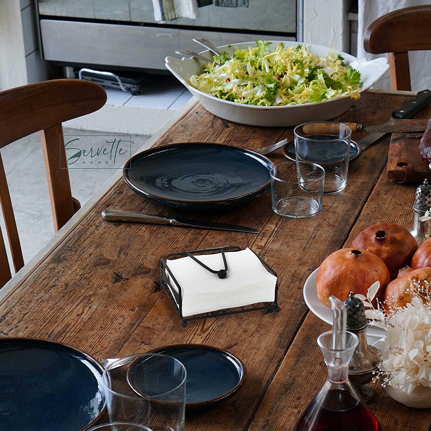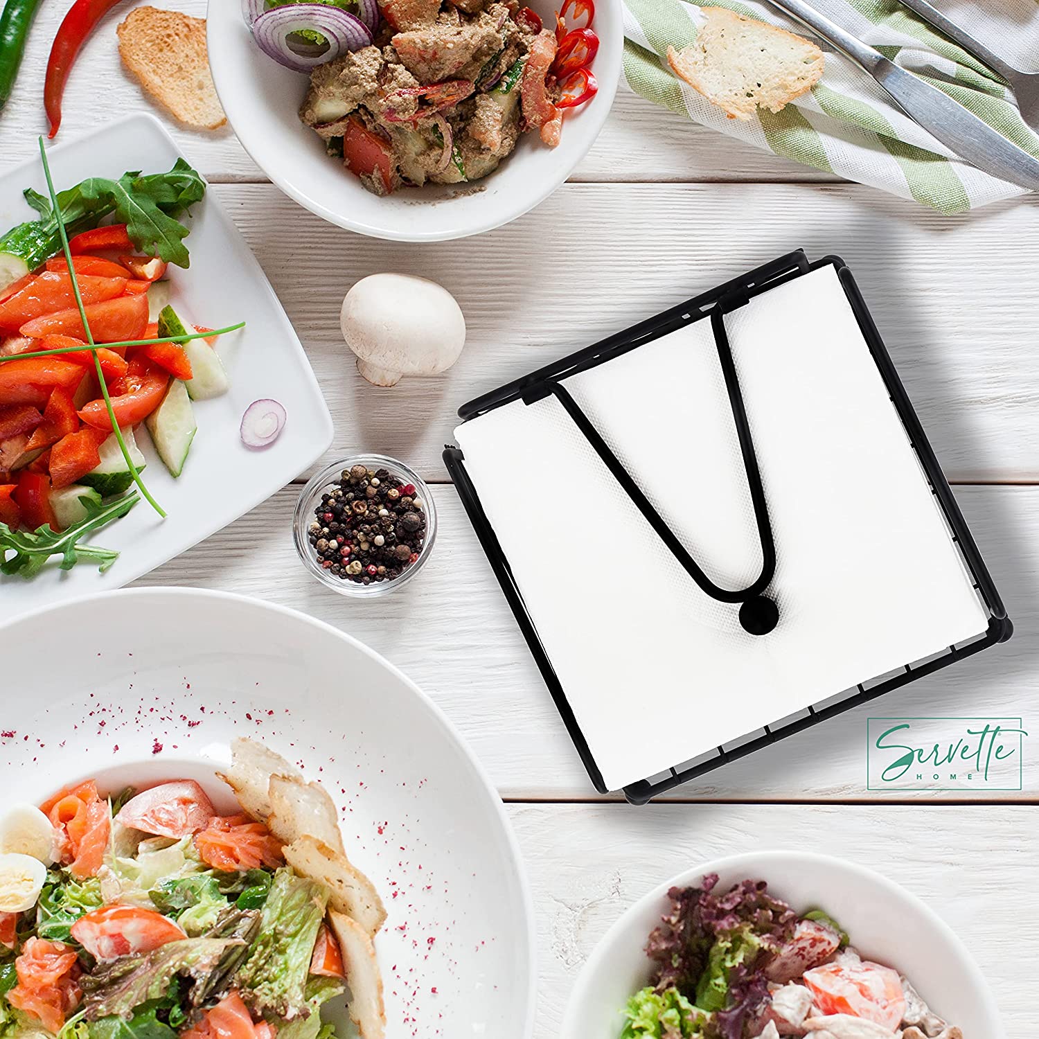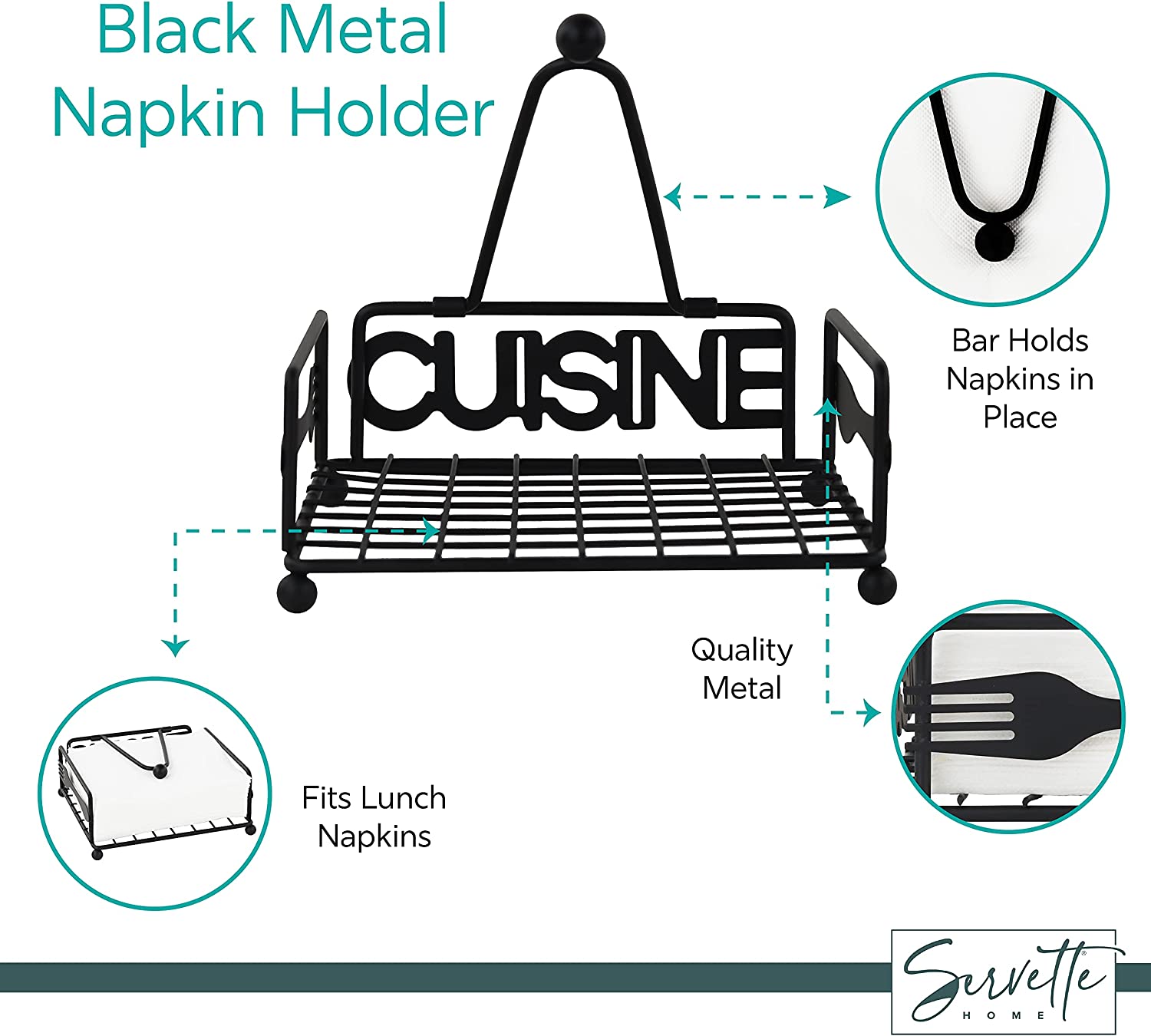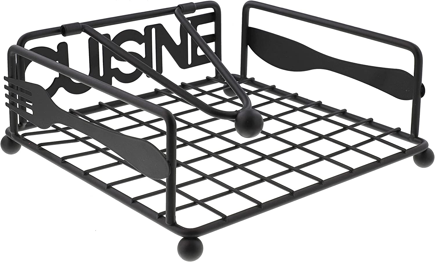 Regular price $15.99This metal napkin stand for lunch napkins is the perfect napkin holder for the counter or table. Great for home or restaurant use, both indoors and outside. The weighted arm holds the napkins in place so they don’t fly all over. The black metal look will be at home in any home or eatery. The word "Cuisine" is written out on the back of the napkin holder, and a fork and knife grace the sides of this beautiful item.