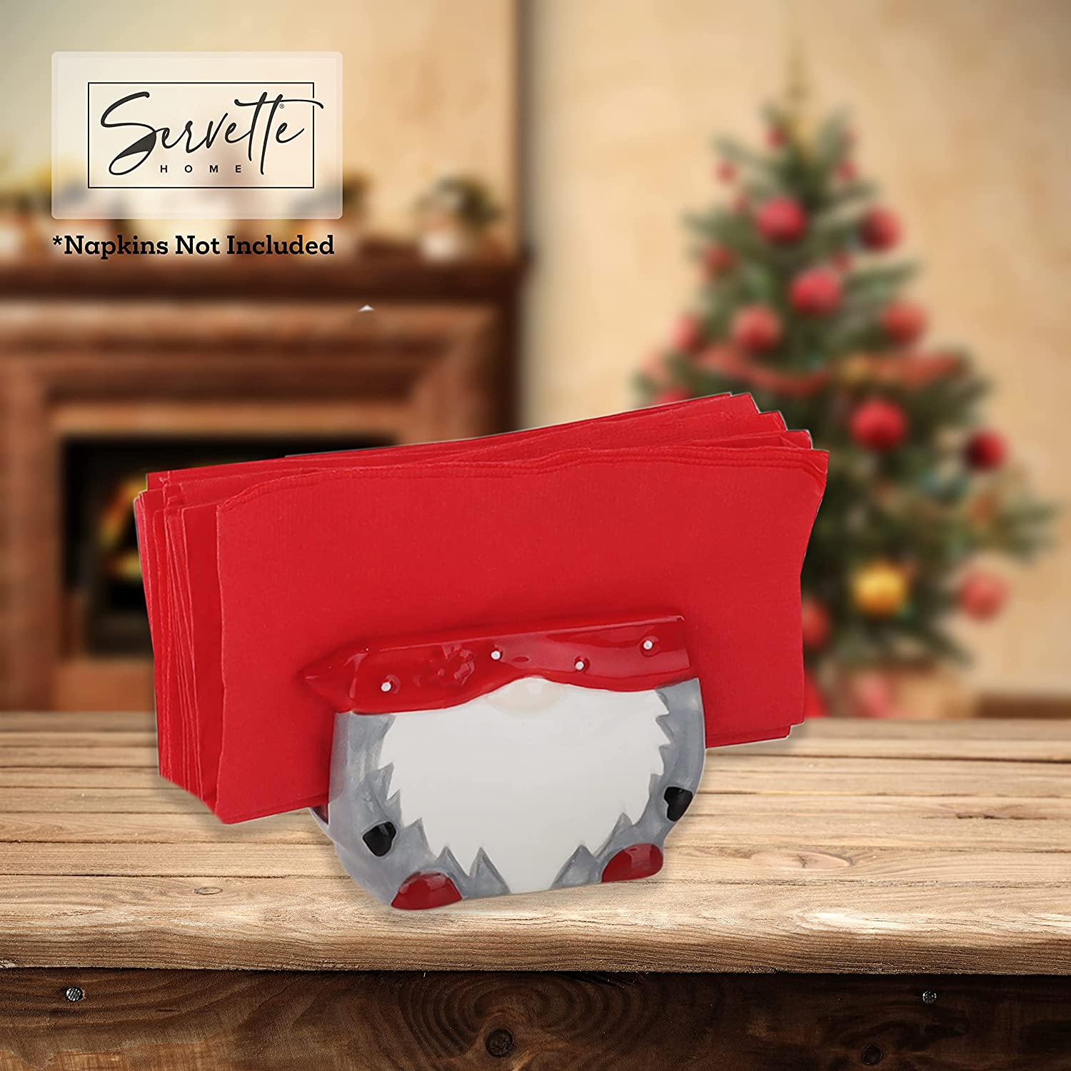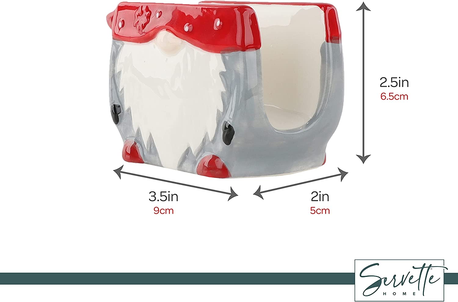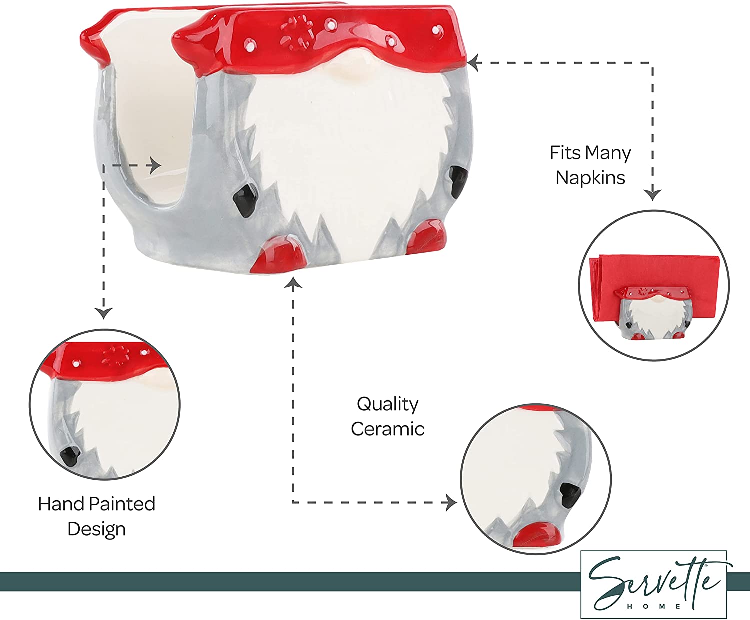 Regular price $15.99Charming Gnome Table Decor will bring style and good luck to your Chrismas Table Setting. Salt and pepper shakers measures 3.5 inches high and napkin holder measures 3 inches tall and 4 inches wide. The Gnomes have red polka dot hats and grey clothing. Made of quality hand-painted ceramic. Small silicone stopper at bottom for filling salt shakers, and small holes at the top for precise pouring.
