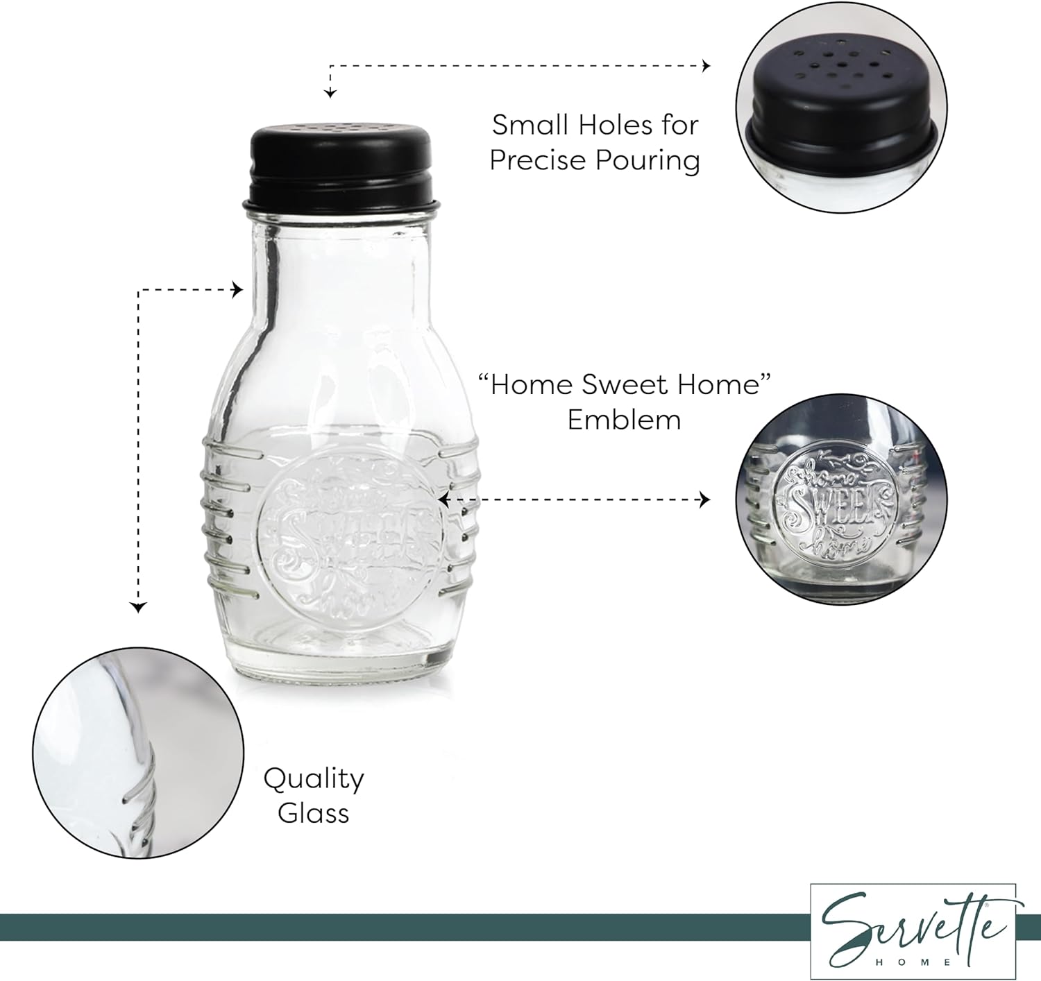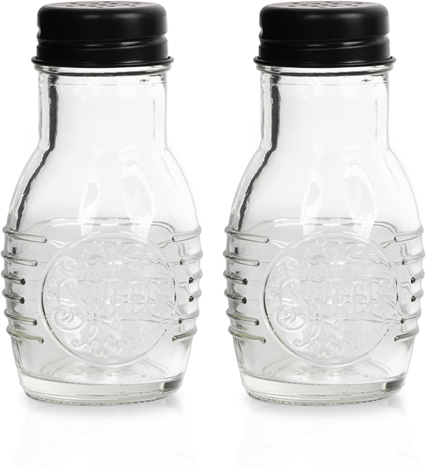 Regular price $9.99These charming salt and pepper shakers add a touch of warmth and personality to any kitchen or dining table. Crafted from clear glass with a matte black metal lid, the set features the endearing phrase "home sweet home" embossed on the front of each jar. At just 4 inches tall and 2 inches wide, the shakers offer ample 3 ounce capacity while taking up minimal counter space. Their see-through glass construction allows for easy visibility of contents, and the small holes in the lids provide precise, controlled pouring every time. Whether filling the shakers or enjoying a meal, these shakers' cozy homespun design is sure to bring a smile.