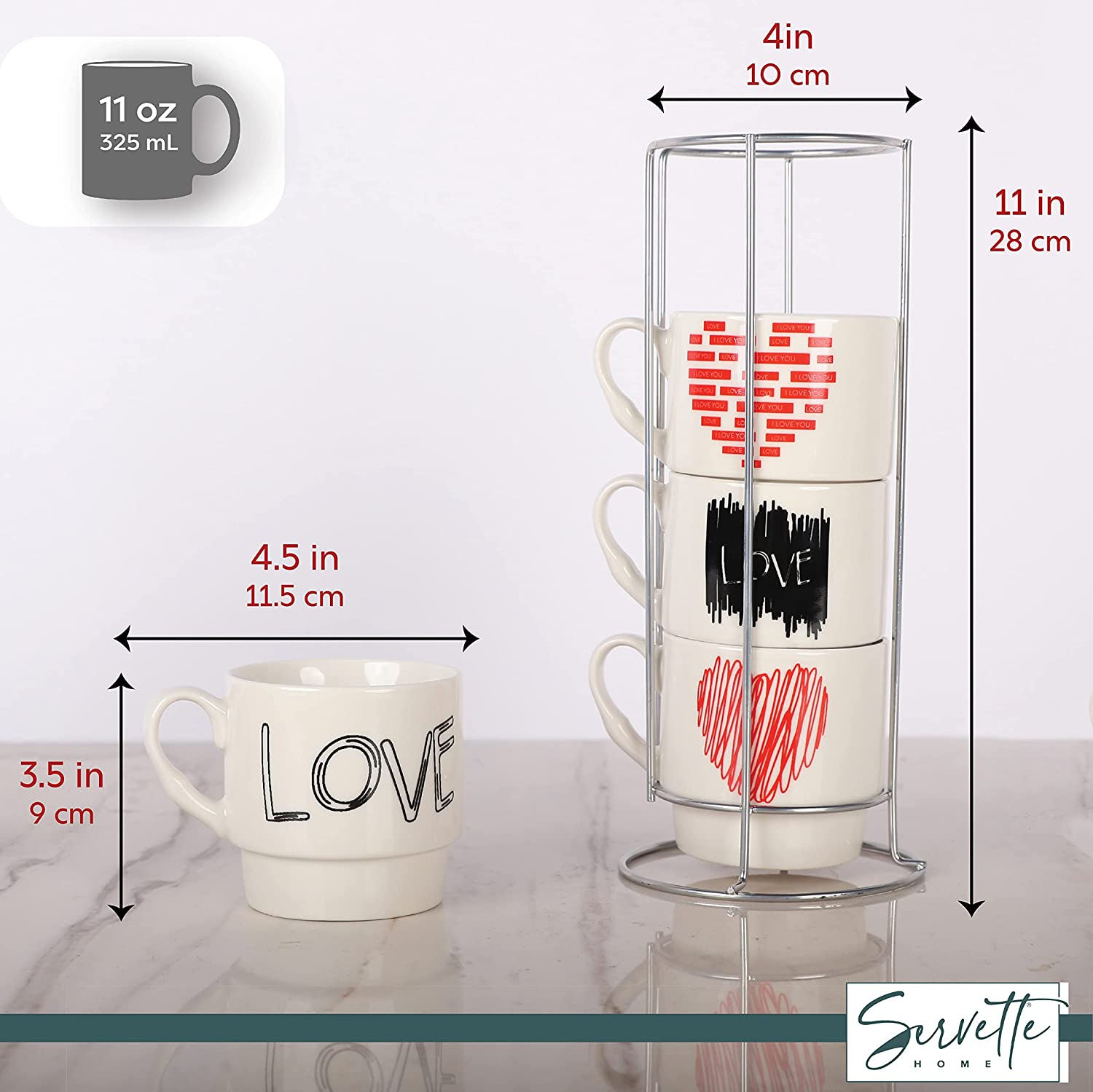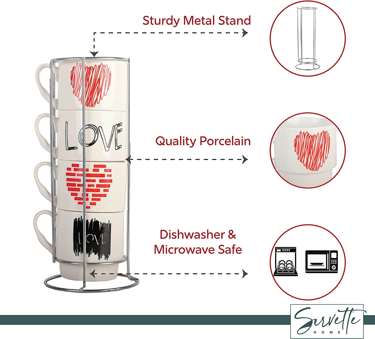 Regular price $29.99Start your day off with Servette Home Ceramic Coffee Mugs. To really enjoy your morning coffee, you need a cup that is both well-made and durable. With these Servette Home 11oz Coffee Mugs you will feel refreshed and ready to start your day. This mug is great for all coffee lovers! Easy to use, just lift out your mug from its stand and enjoy! Store your ceramic mugs in the convenient stand. Keeping your counters clutter free! Metal mug stand is durable and sleek. This stand will hold your 4 ceramic mugs safely, keeping your mugs from tipping over. These mugs are a perfect fit for any kitchen. Gift them to friends and family!