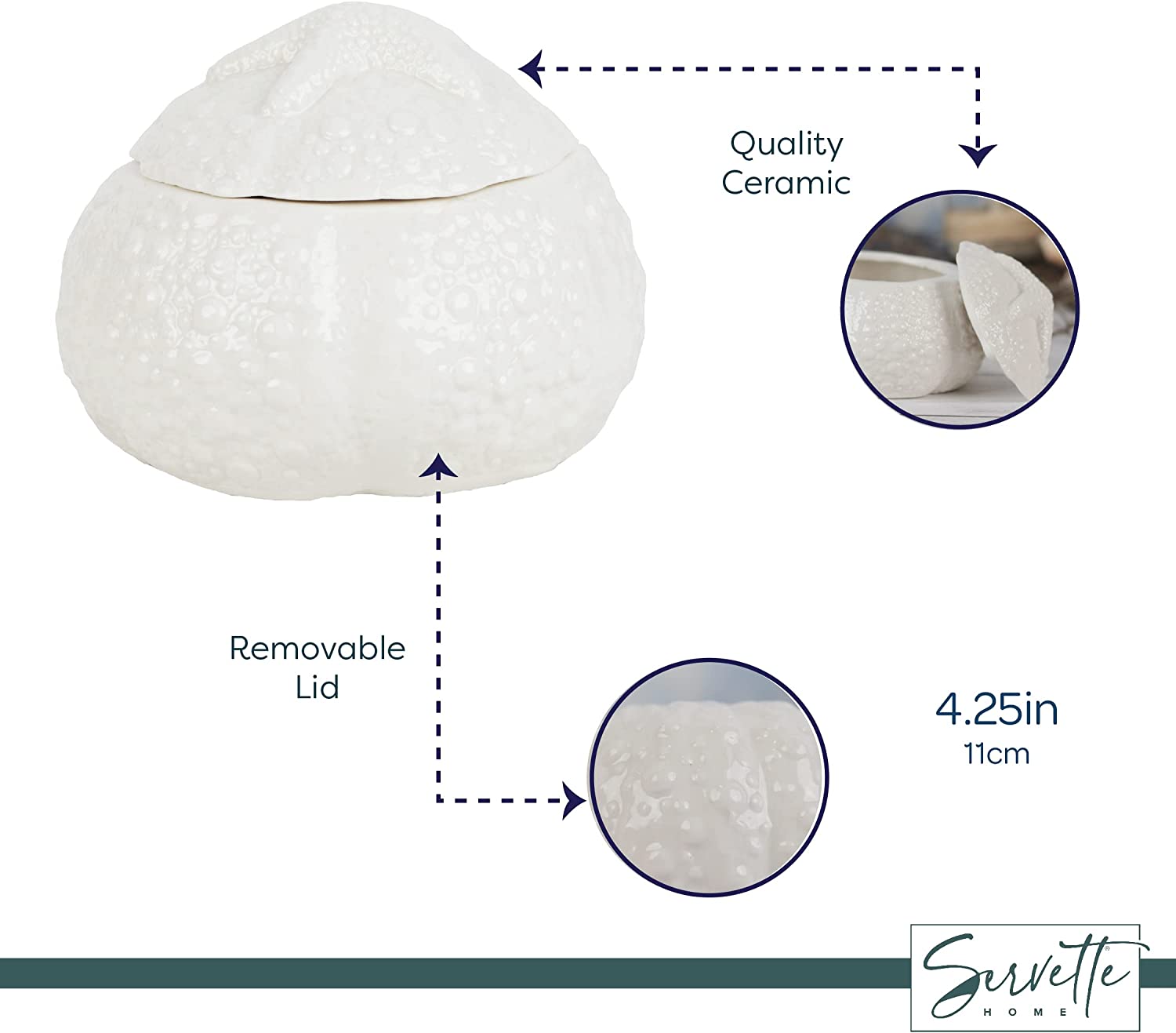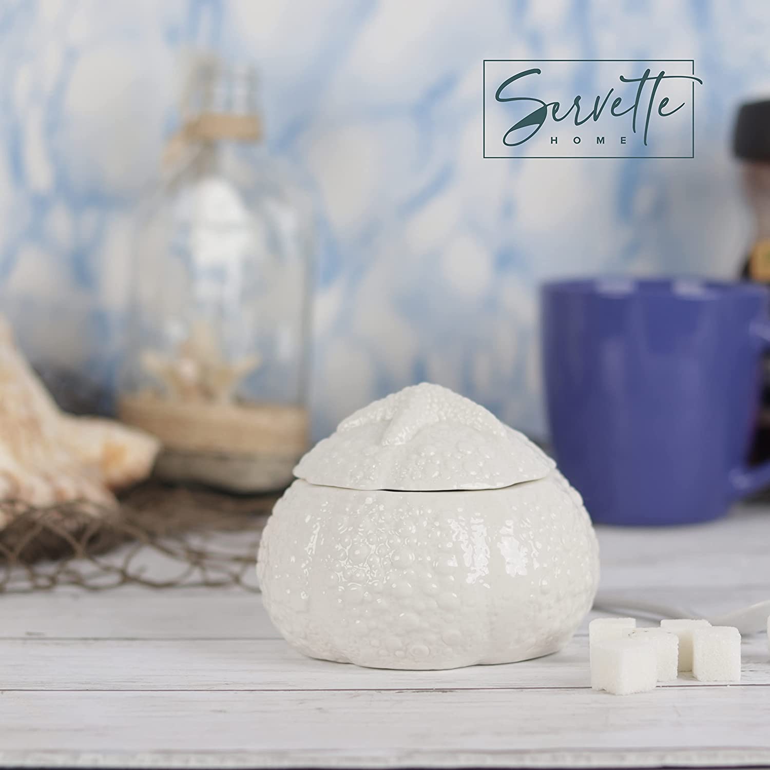 ADORABLE MARITIME OCEAN THEME DESIGNS these novelty sugar bowls are great for collections, or daily kitchen use. QUALITY made of strong painted and glazed porcelain, this bowl comes with a lid and the top has a small indentation for resting a sugar spoon (not included). MULTI USE you can use this bowl as a sugar or coffee bowl for the kitchen, or it can also be used to hold knick-knacks, jewelry, coins or other small items handy. DIMENSIONS: Approximately 4 inches high and 4.25 inches wide. GREAT GIFT whether you are buying this as a gift for a friend or as a gift for yourself you will love this quality kitchen container by Servette Home