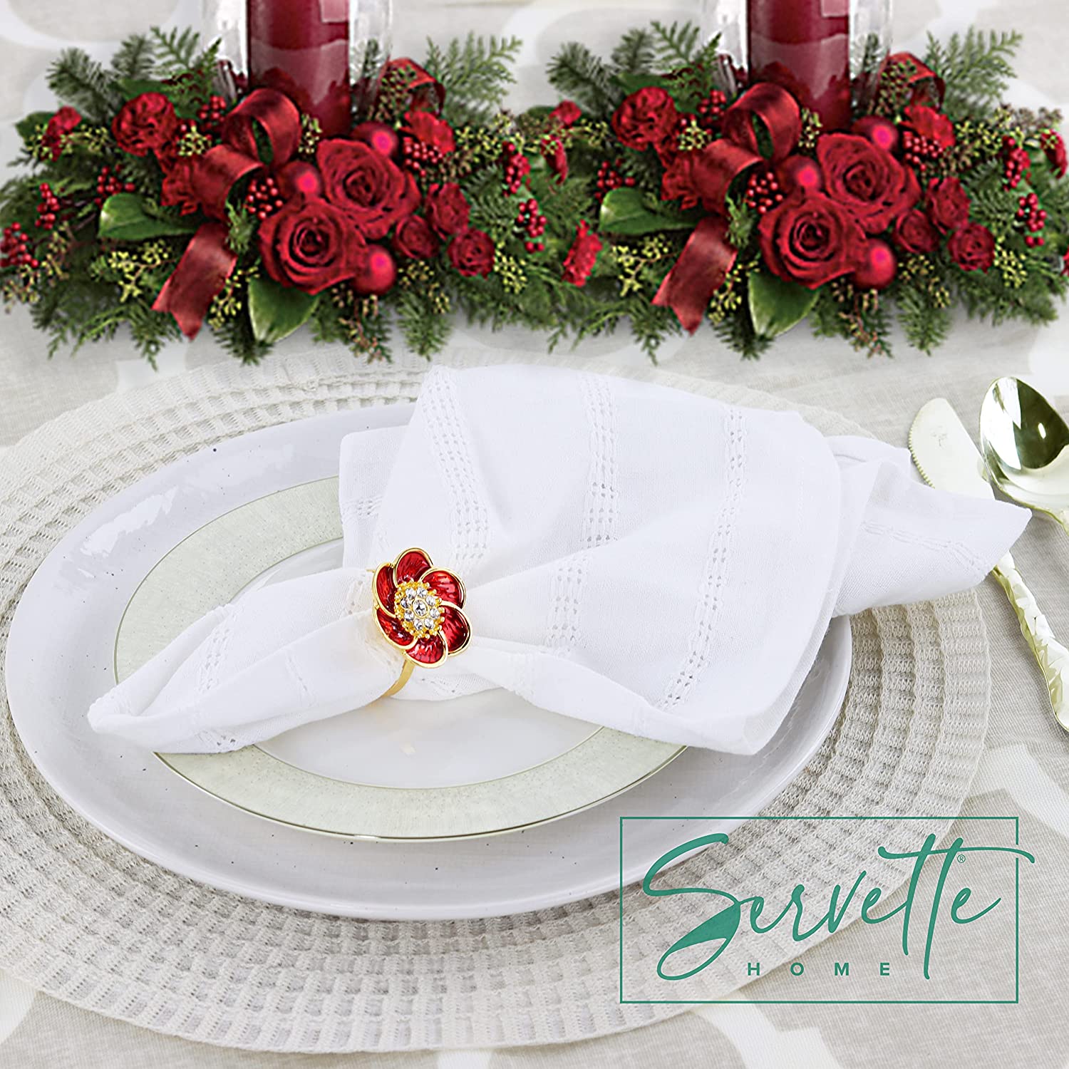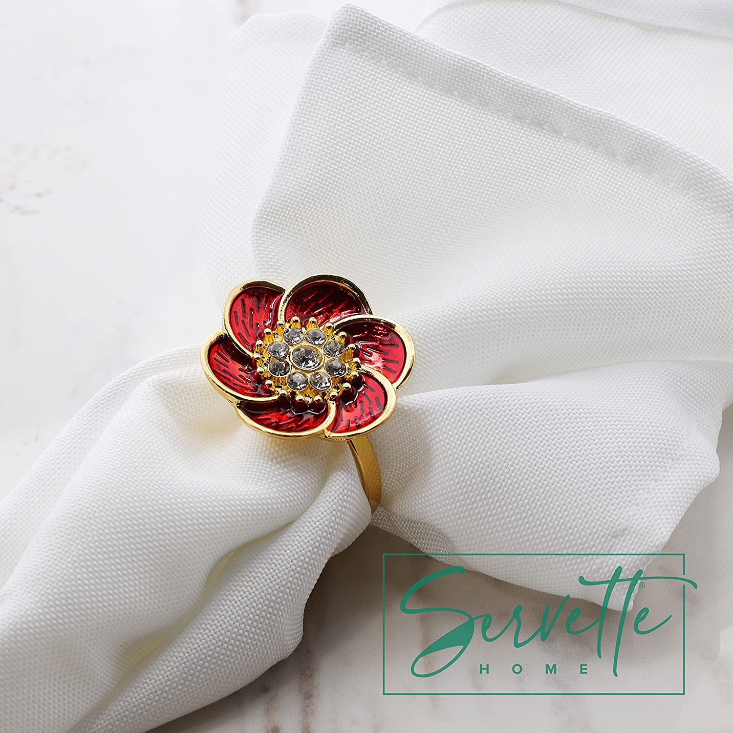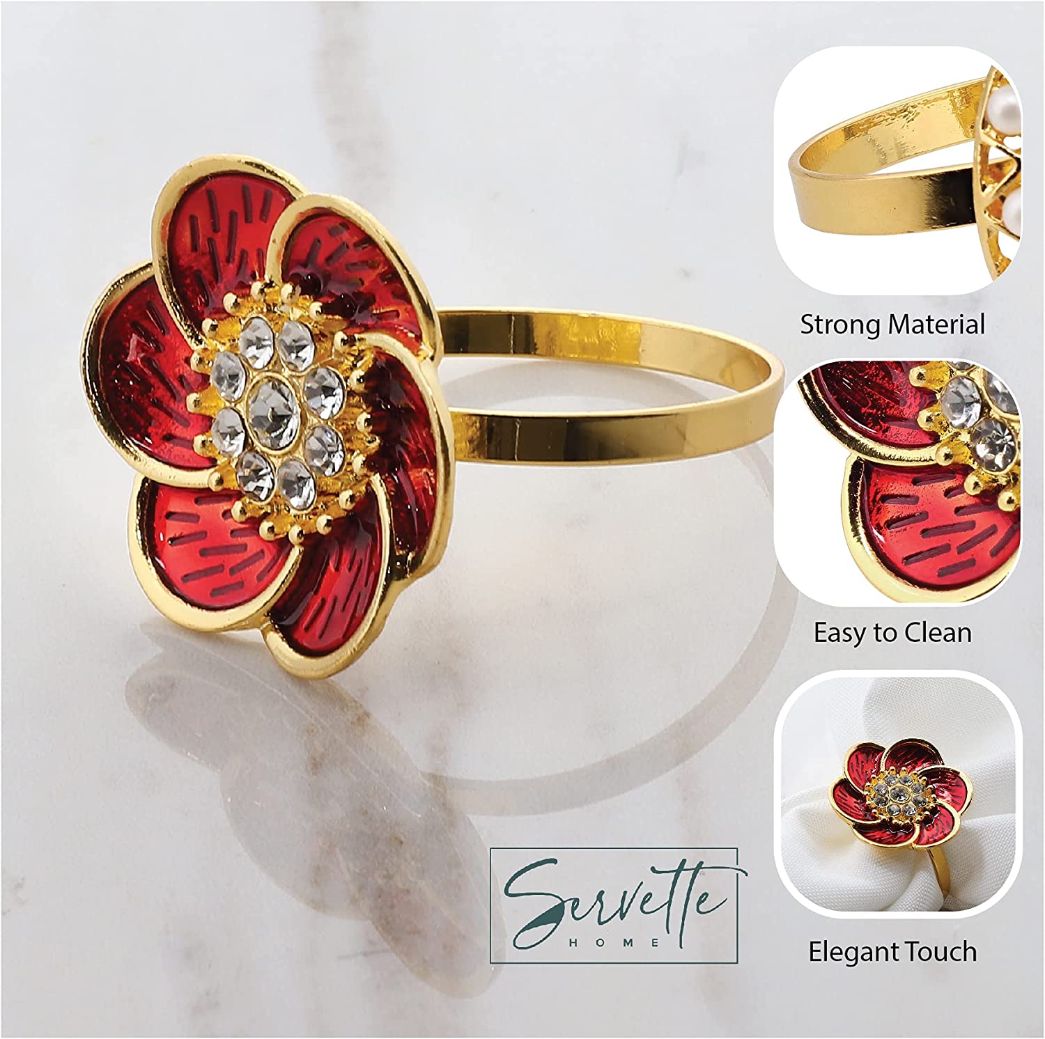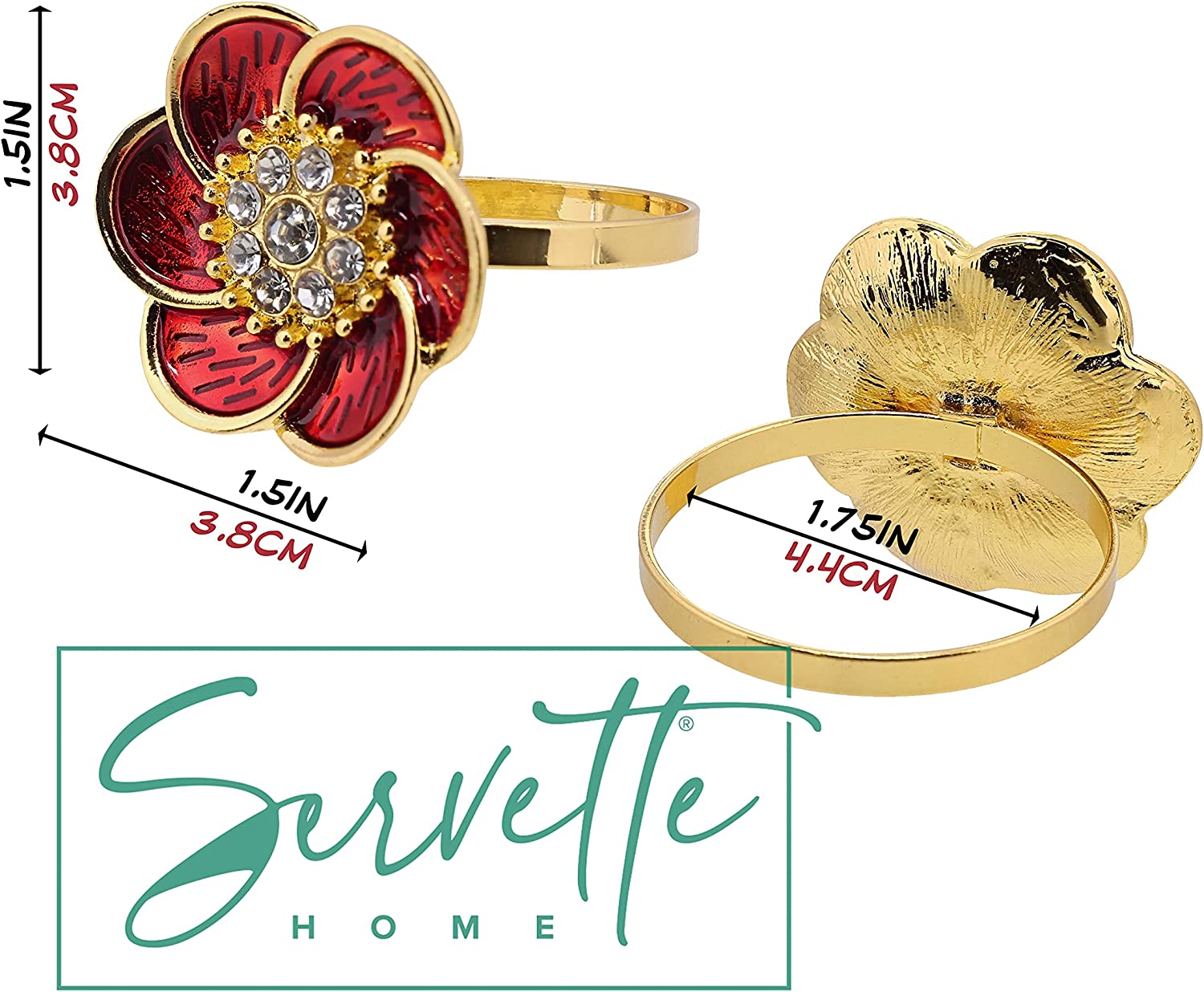 Bring an elegant and stylish touch to your table décor with these gorgeous red and green flower napkin rings set. The flower napkin rings are gold with red or green petals and diamond centers. Perfect colors for Christmas Parties or other events such as weddings and banquets. They are made of gold alloy and look stunning with both cloth or disposable paper napkins. You will love these elegant napkin rings at your next dinner, celebration, wedding, Christmas, New Years, Thanksgiving party and more. Also makes a great housewarming or hostess gift. Set of 2 Napkin Rings.