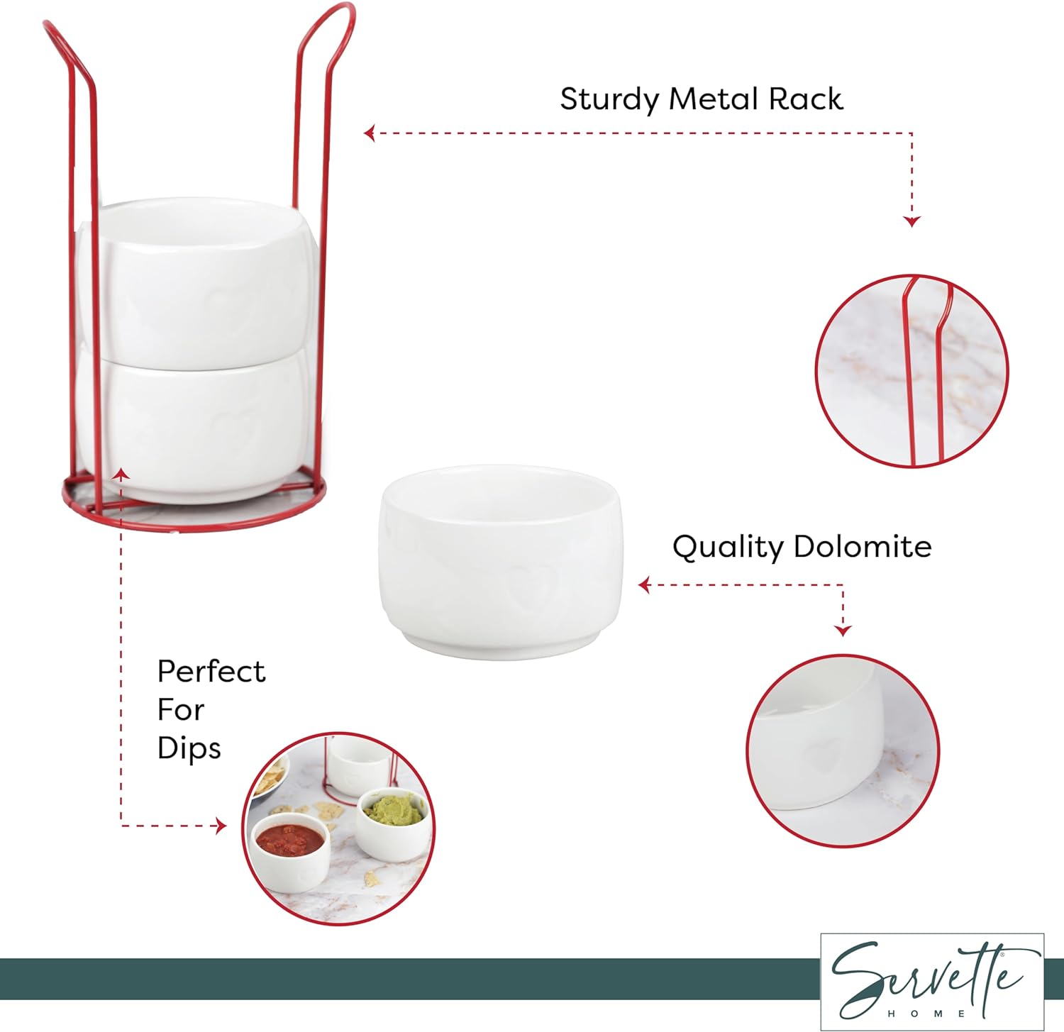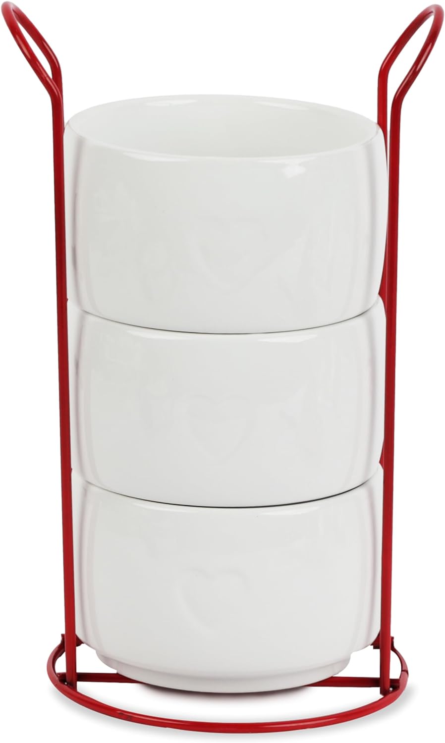 Servette Home Dolomite Ceramic Bowls with Heart Design, 3-Tier Stackable Set, 8oz Capacity, Red Rack