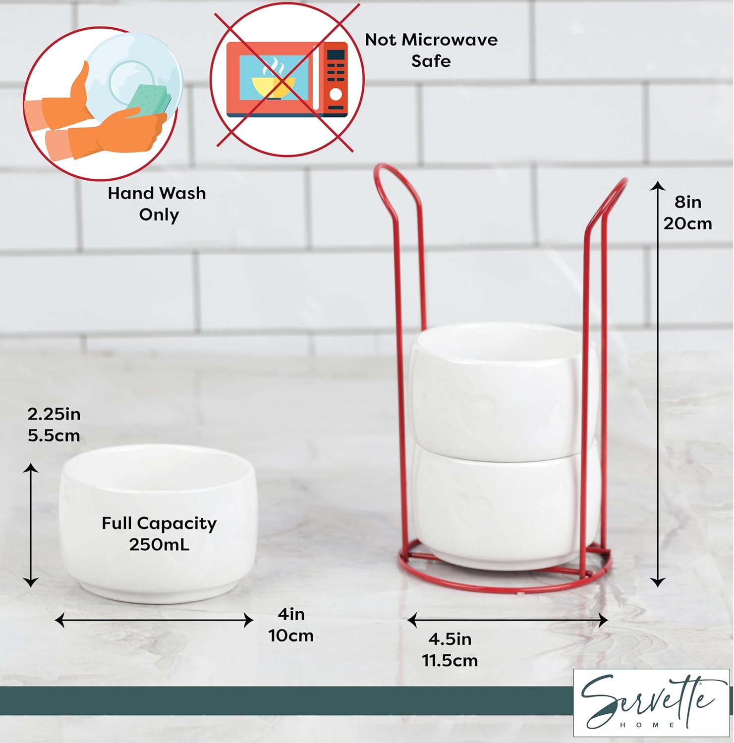 These 3 stacking dolomite bowls neatly stack one inside the other for compact storage in cabinets or on counter tops. Each of the 3 bowls features a heart-shaped impression on the front, adding a touch of charm to any table or display. Made of durable dolomite stone, these bowls are built to withstand daily use in the kitchen or home. With a capacity of 8 fluid ounces/250mL per bowl, there is plenty of space for snacks, sides or small meals. A red wire rack is included to keep the stacked bowls organised on shelves or counters when not in use.