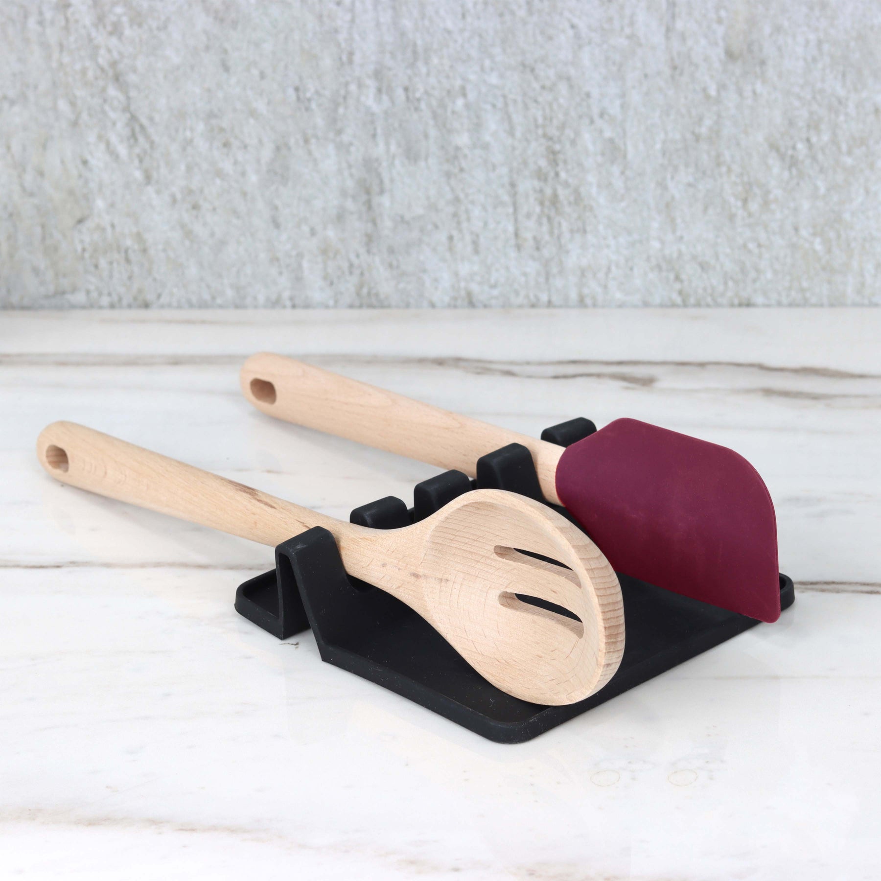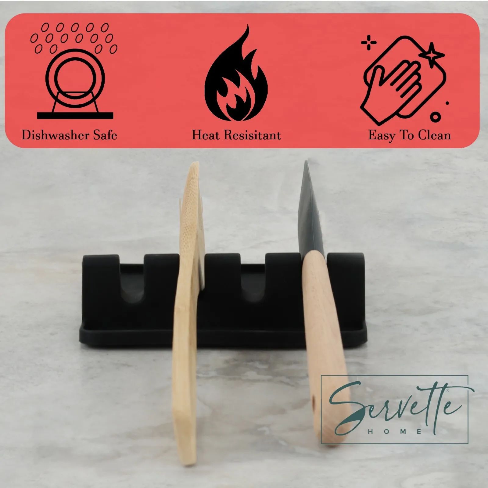 Regular price $7.99This black silicone spoon rest for the countertop has 4 slots where you can place up to four spoons, spatulas, or other utensils while cooking. The wide drip pad at the bottom with raised edges will catch any liquid spills or drips keeping your countertop tidy while you cook .When cooking is done, cleanup is a breeze! Just hand wash this black spoon rest or throw in the dishwasher so you can start all over again tomorrow! Perfectly sized at 5.25 x 5.25 Inches. Fits most standard cooking utensils. Non Slip BPA free silicone. Heat Resistant. Does not include utensils.