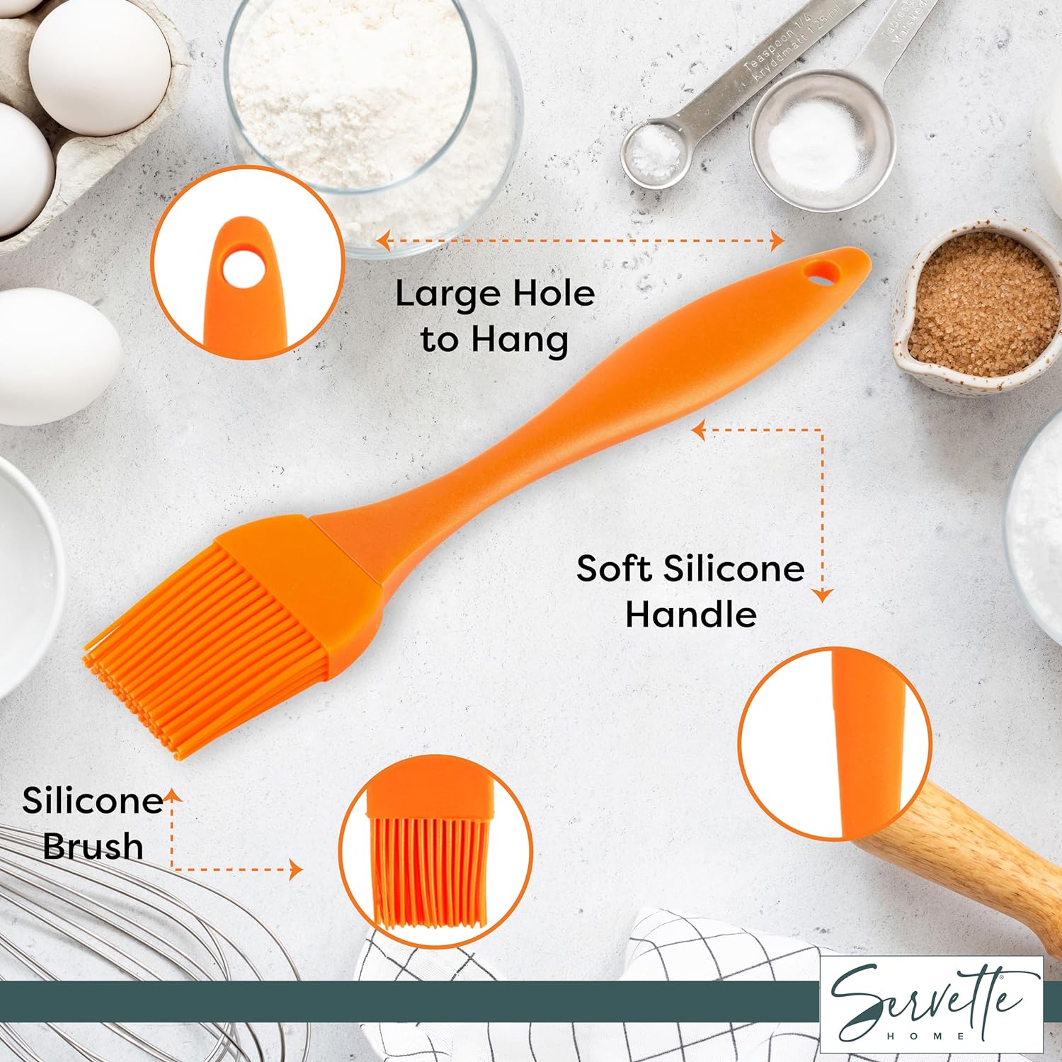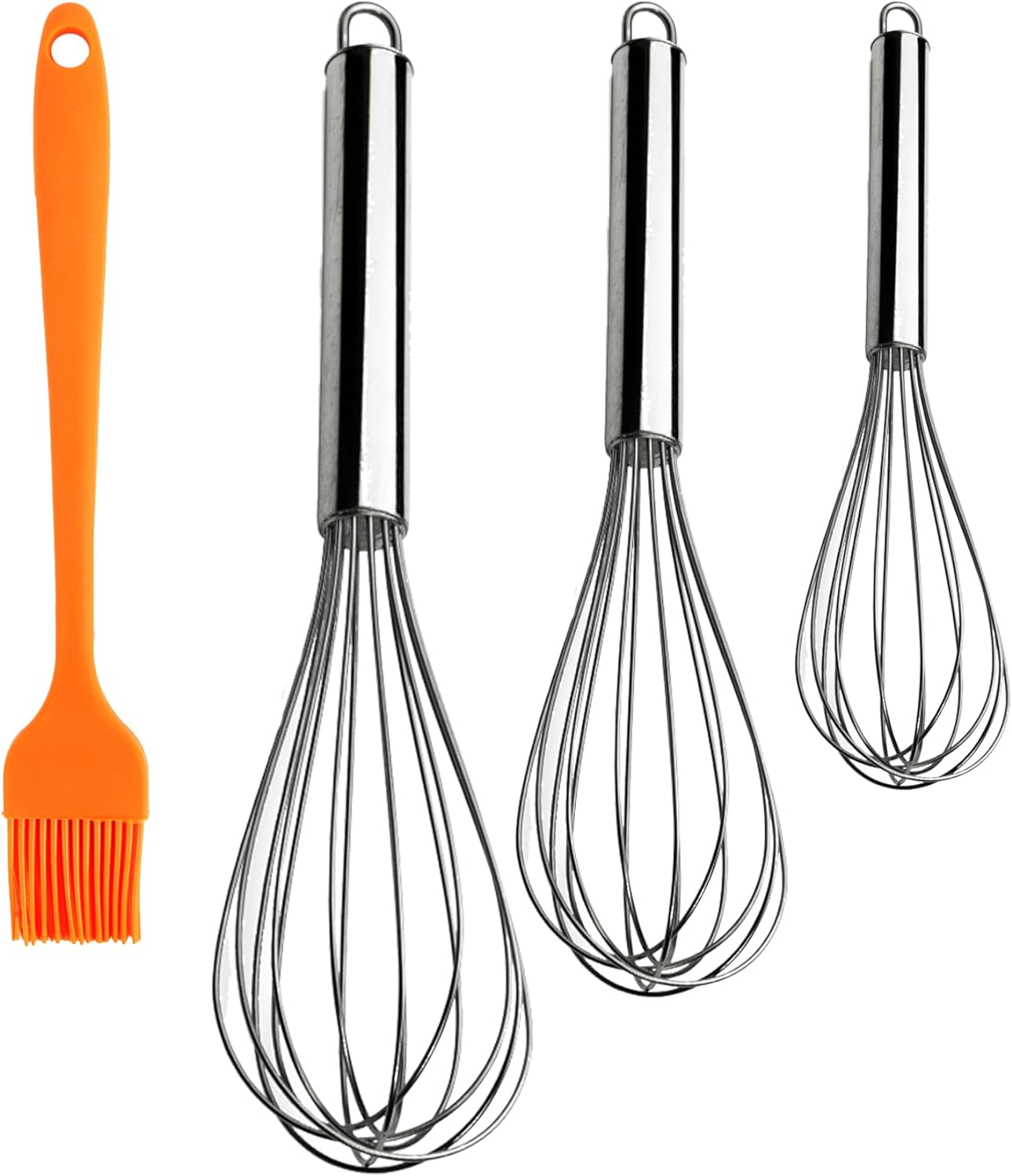 Regular price $14.99 Sale price $13.99 Save $1.00This set contains everything you need to whip, fold and mix ingredients with ease. Three whisks in different sizes - a 9 inch for heavy mixing, 7 inch for lighter batters and 11 inch for large bowls - allow you to take on any recipe. The whisks are crafted from durable stainless steel that stands up to rigorous use without bending out of shape. Their tapered designs incorporate thin yet sturdy wires that thoroughly blend wet and dry ingredients with minimal effort. Also included is an extra wide silicone basting brush for evenly coating pans and basting meats and vegetables as they cook. Its heat resistant silicone handle provides a comfortable, non-slip grip even when hands are coated in oil or juices. This versatile kitchen tool set takes the guesswork out of whisk, mix and baste tasks.