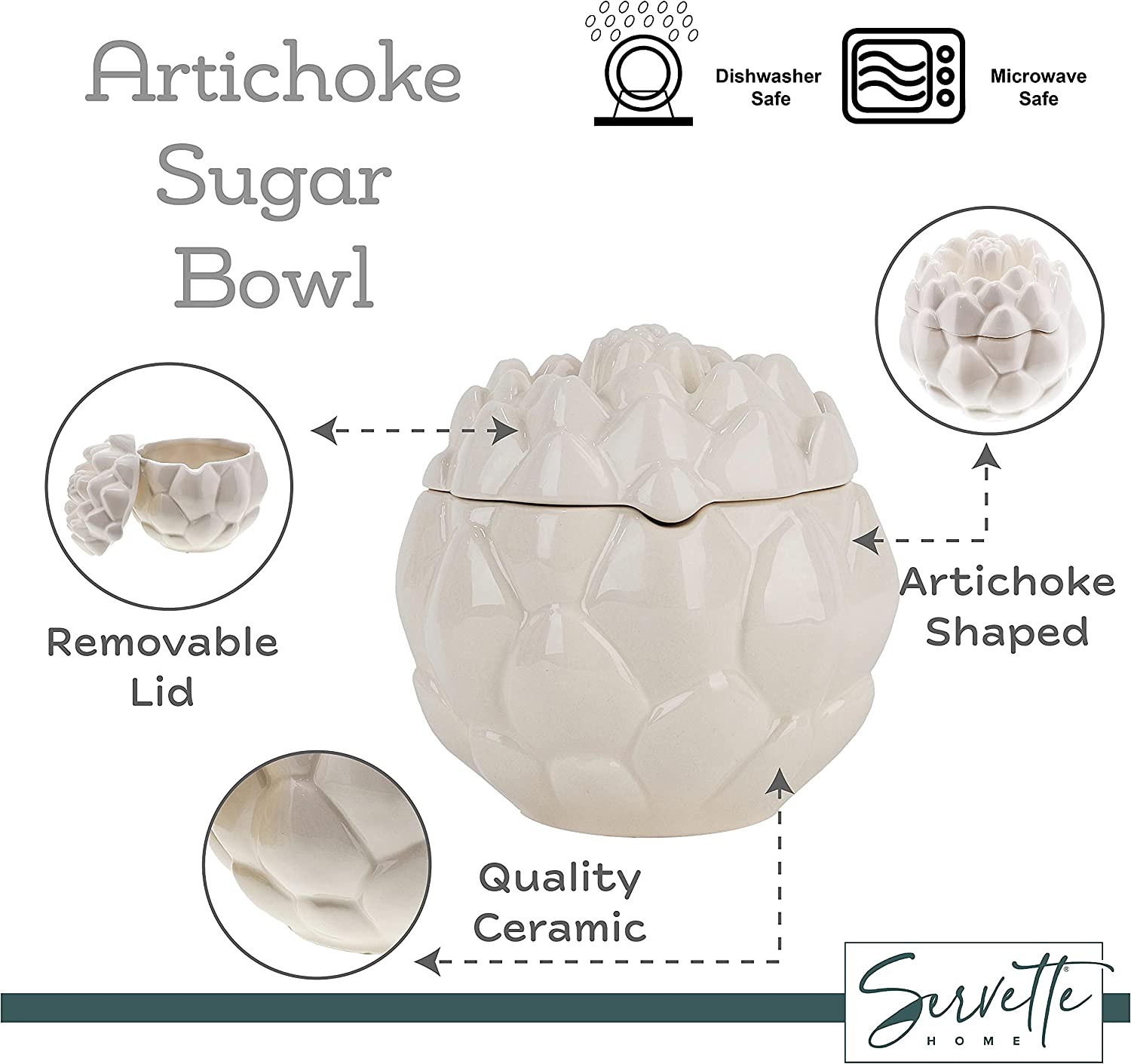 Regular price $16.99This artichoke shaped sugar bowl from Servette Home will gracefully elevate your counter or table décor. Can be used to store sugar or spice, condiments, granola or even jams. Bowl comes with a matching lid that fits on top securely. This stylized covered sugar jar is fashioned from durable ceramic, and magnificantly hand-painted. Elegant design!