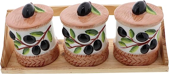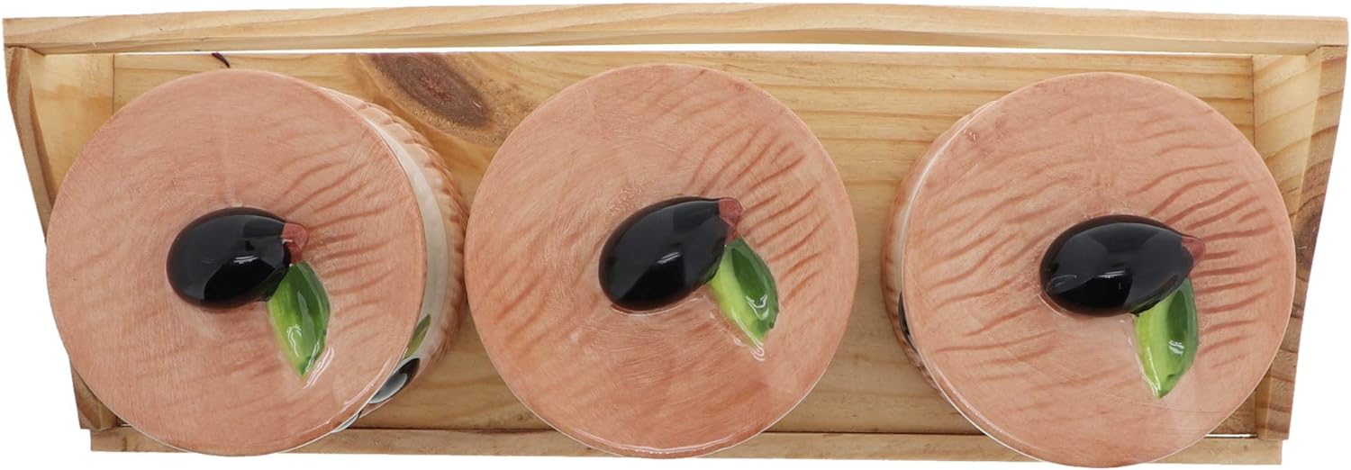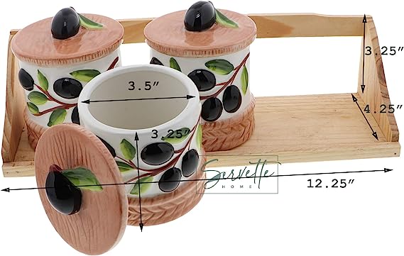 Enhance your rustic and farmhouse decor with this charming Wooden Stand with Three Ceramic Pots in an olive design. This set features a sturdy wood rack accompanied by three ceramic canisters, each equipped with a lid. Perfect as a teacher appreciation gift or for adding a touch of rustic elegance to your kitchen or dining area, these canisters are versatile and functional. They provide convenient storage for coffee, tea, sugar, or other condiments, keeping them organized and easily accessible. Each ceramic holder measures approximately 3.5x3.5 inches, while the wooden stand spans 12.25 inches across.