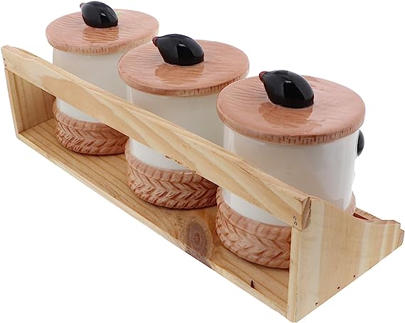 - Rustic and Farmhouse Decor: The wooden stand with three ceramic pots adds a rustic and farmhouse-inspired charm to your kitchen or dining space, enhancing your overall decor.